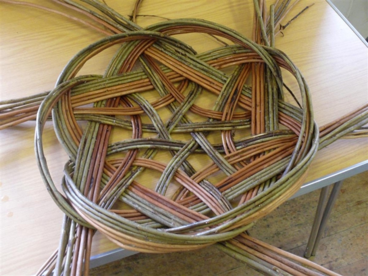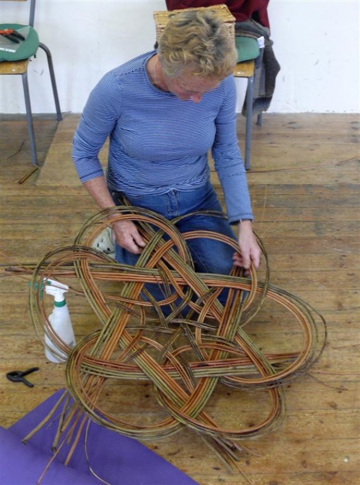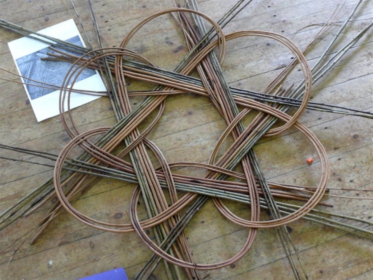 The focus of the September 2010 self help group meeting at Hepple was on making Celtic Knot baskets. Starting with laying out six sets of six 7 foot long rods the sequence of weaving the basket is shown in the attached images. To make the weaving easier two types of rods were used, brown and buff. At first the tips are pulled through the weaving and butts are pulled through at the end. The sequence for weaving the second round of weaving is as follows: