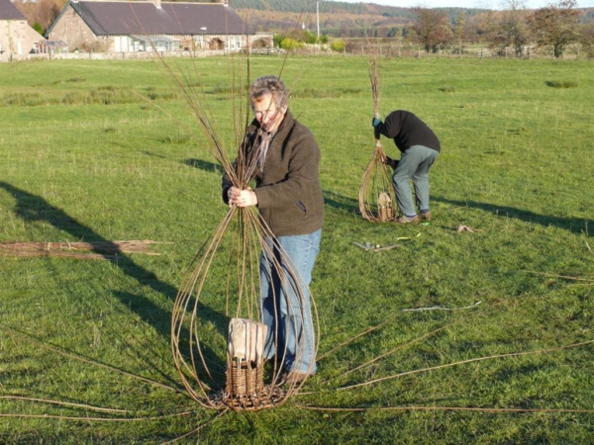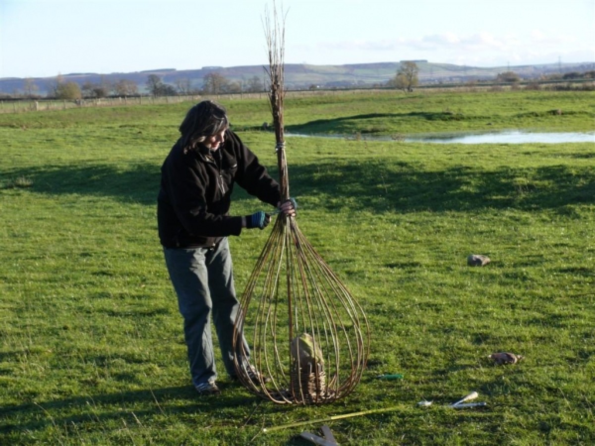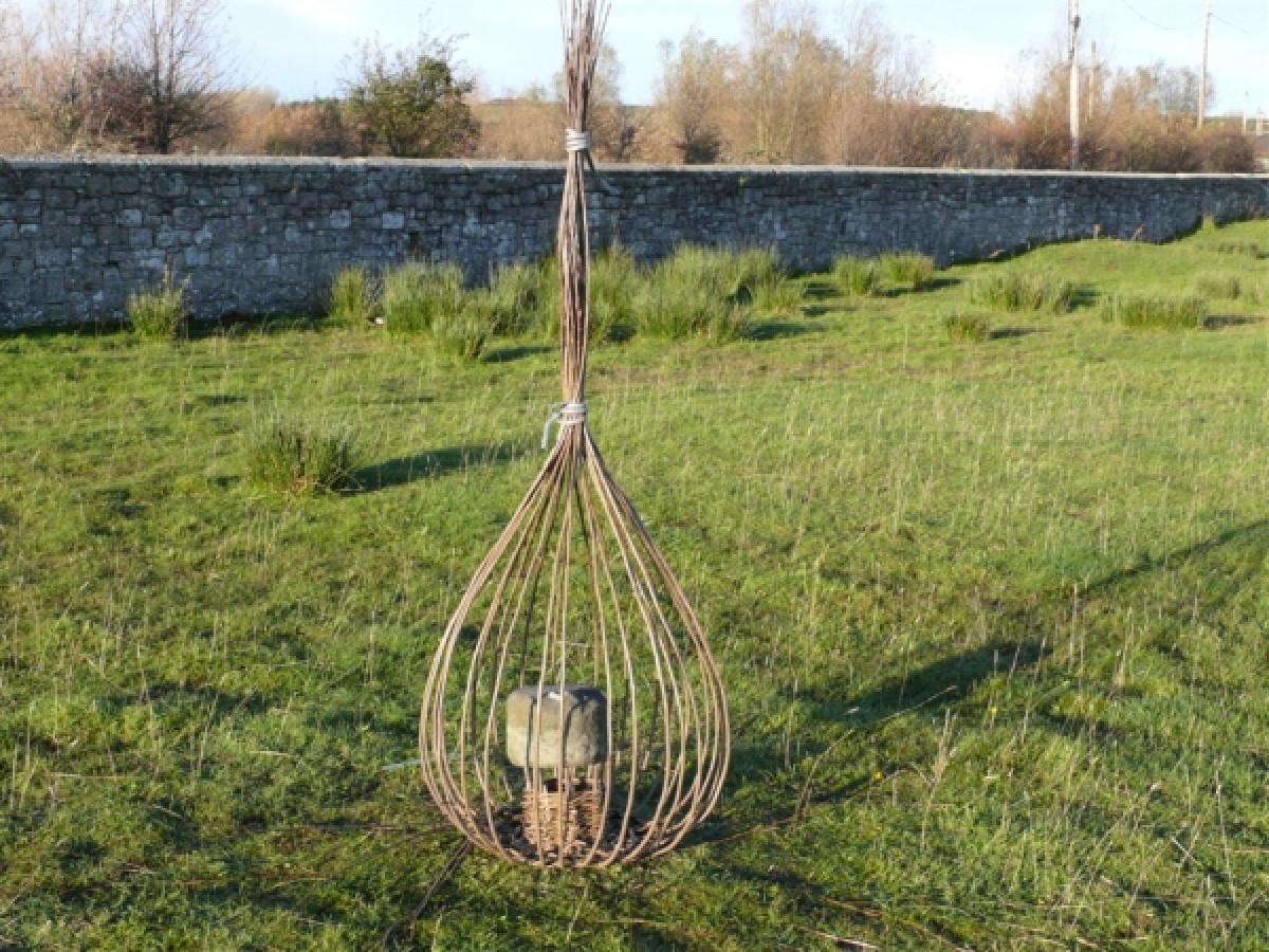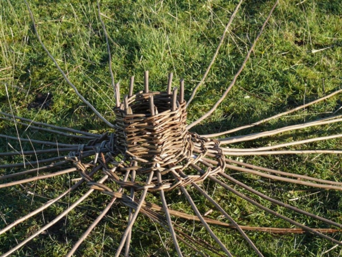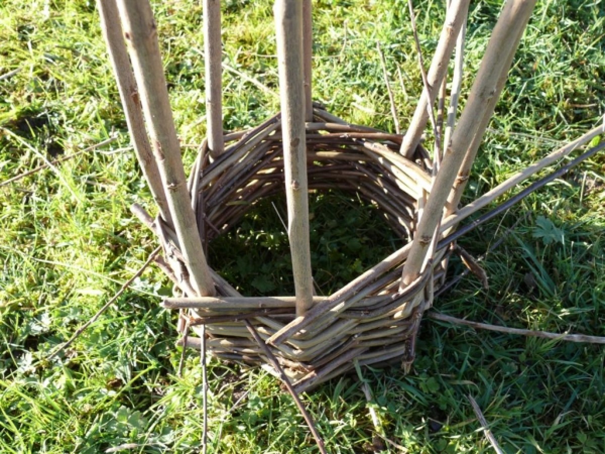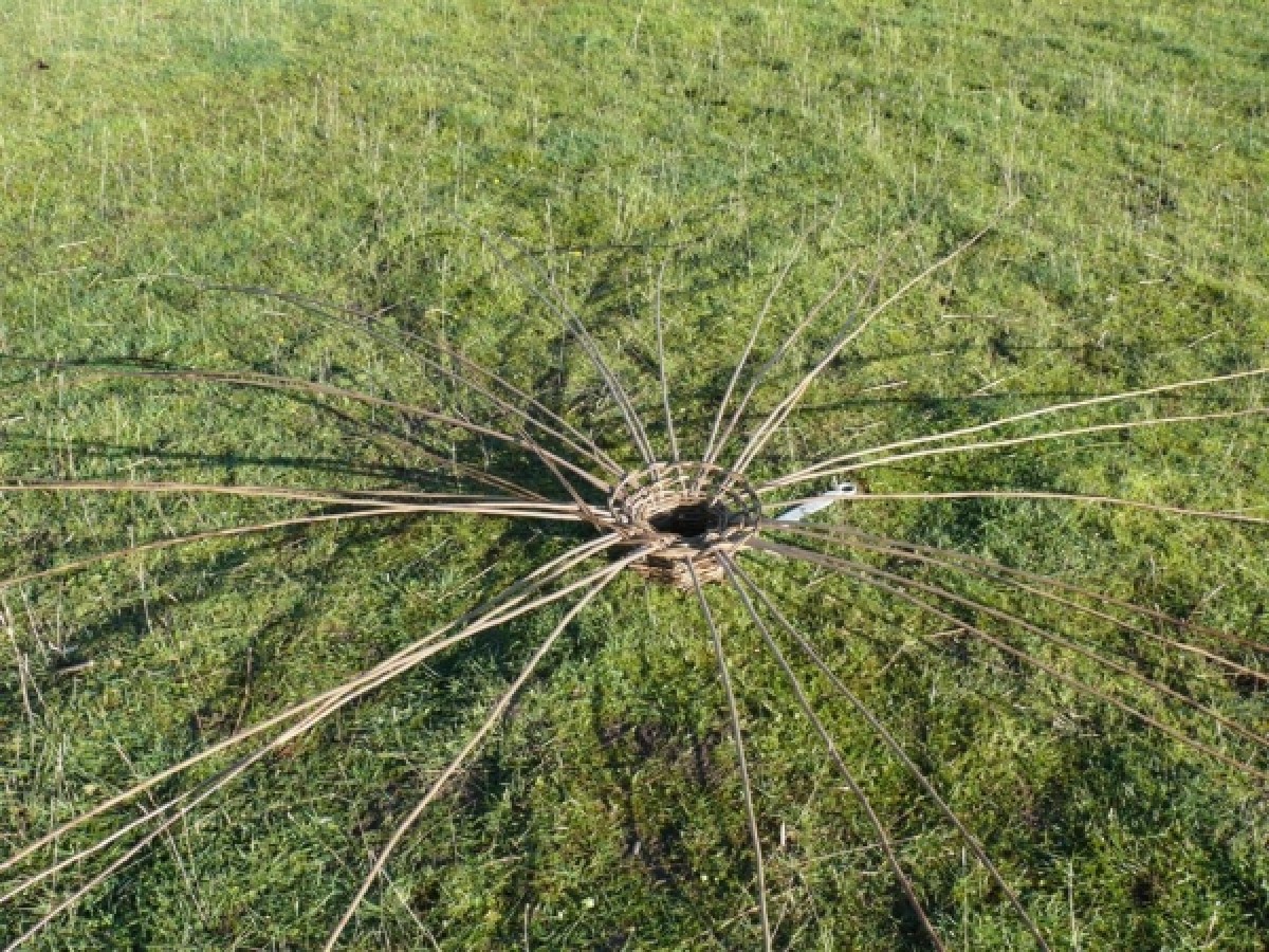 Weave with two rods once round as close as possible to the other weaving. The next round to be a thumbs width (circa 1 inch) from the first round so spiralling round, continue 3 times round keeping shape as flat as possible and stakes evenly spaced. Weaving should be now no more than 10 inches in diameter. The gaps must not be too wide or the lobsters will steal the bait.