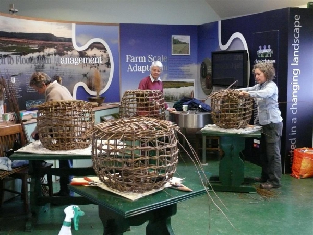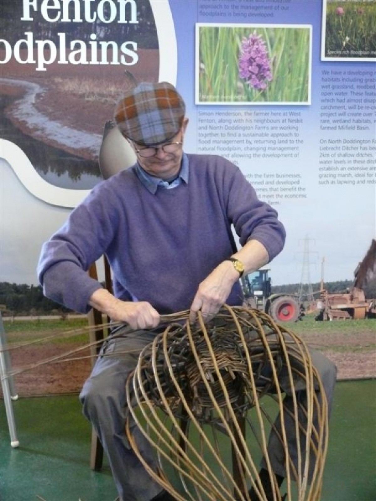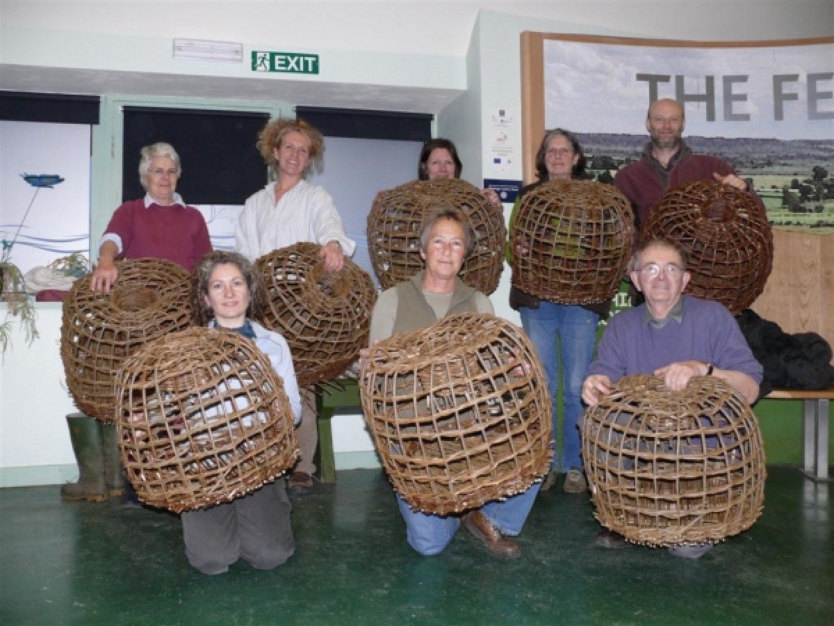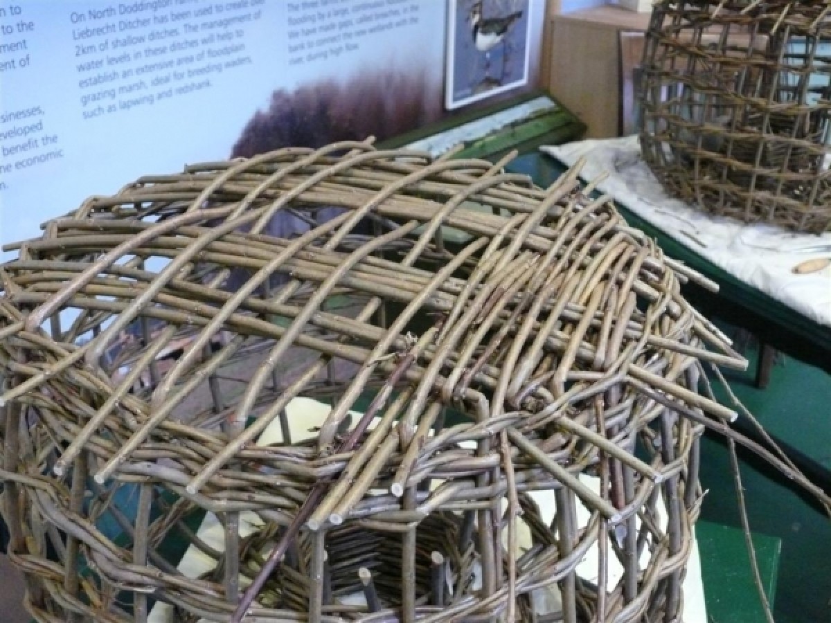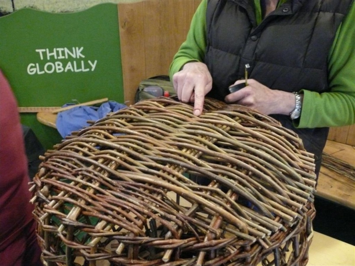 Weave with two rods once round as close as possible to the other weaving. The next round to be a thumbs width (circa 1 inch) from the first round so spiralling round, continue 3 times round keeping shape as flat as possible and stakes evenly spaced. Weaving should be now no more than 10 inches in diameter. The gaps must not be too wide or the lobsters will steal the bait.