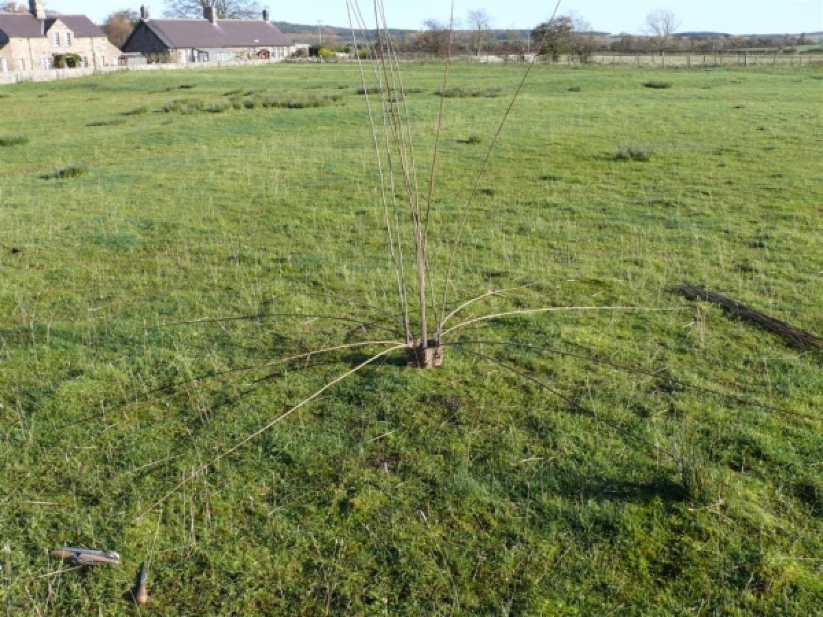 Then add 8 more 7 foot stakes beside existing ones. (To left of originals & push 3 inches into ground) Trim tips of the stakes and then gently pull two stakes out on either side of the body. (Encourage the stakes to bend with your foot) Keep the rod angle low along the ground and push the tips into the earth. Do one pair and then the opposite pair. Follow on with the rest of the stakes until all of the tips are inserted into the earth.