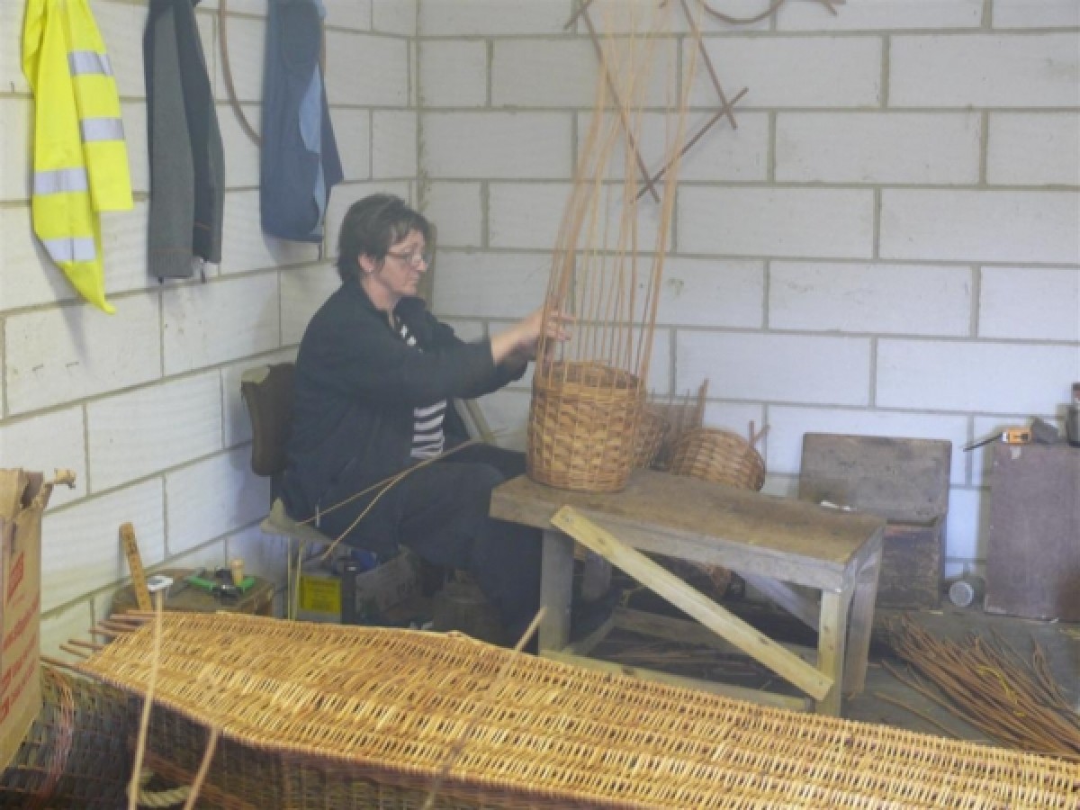 Basketmaking; the willow must be soaked then mellowed. The maker sits on a plank with the basket on a lapboard in front of him/her. Tools are a knife, secateurs, a bodkin and a rapping iron.