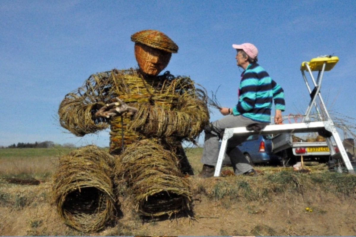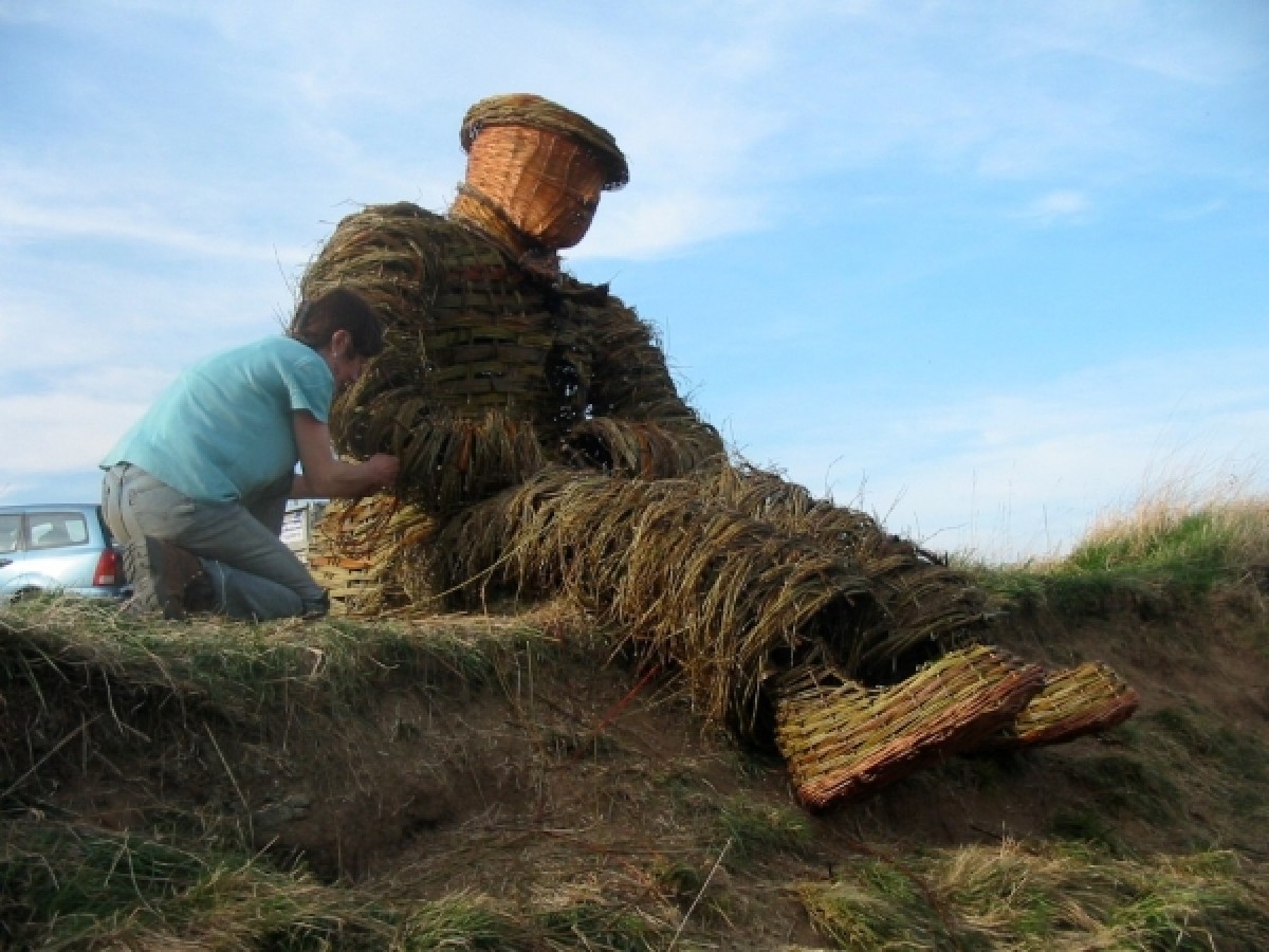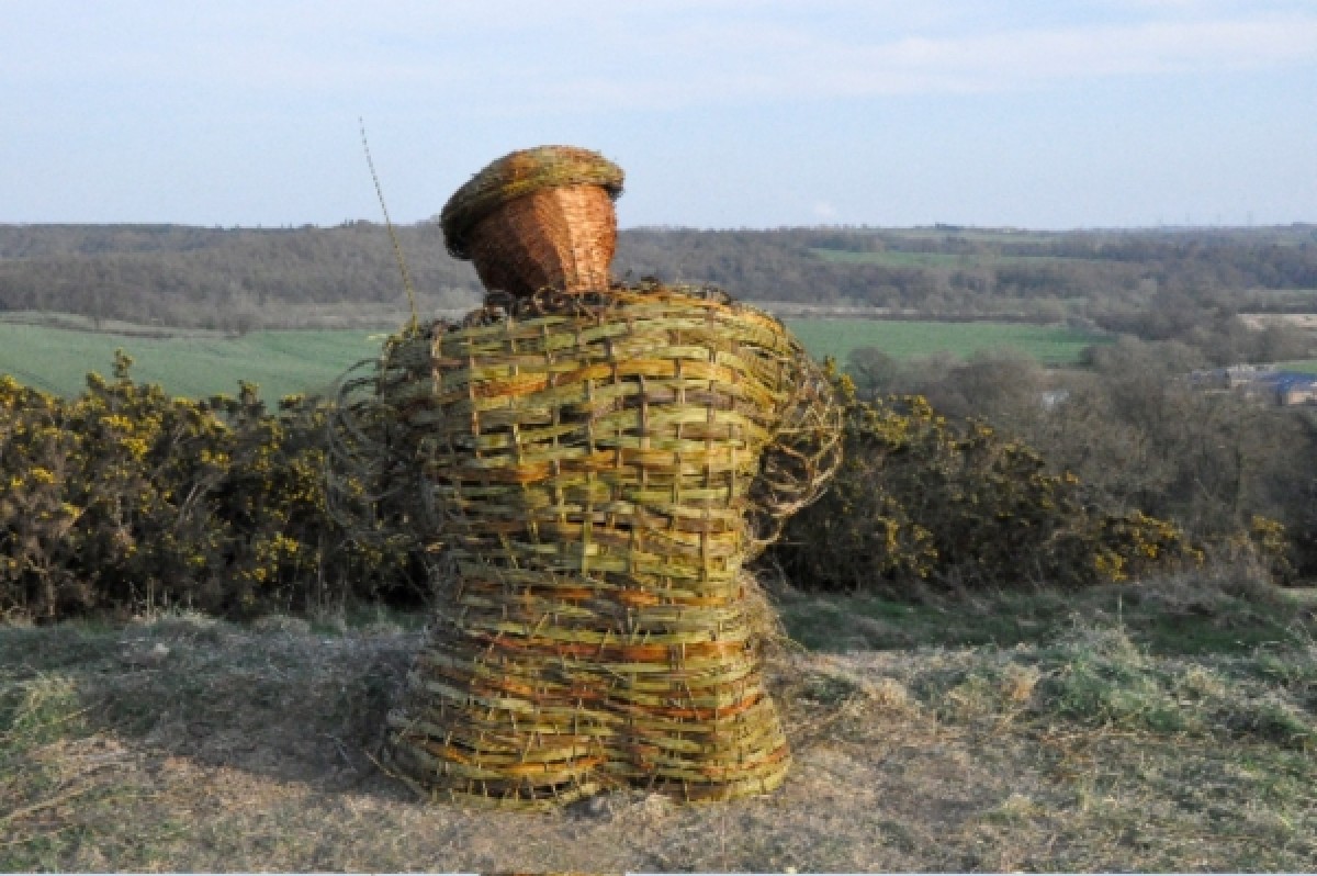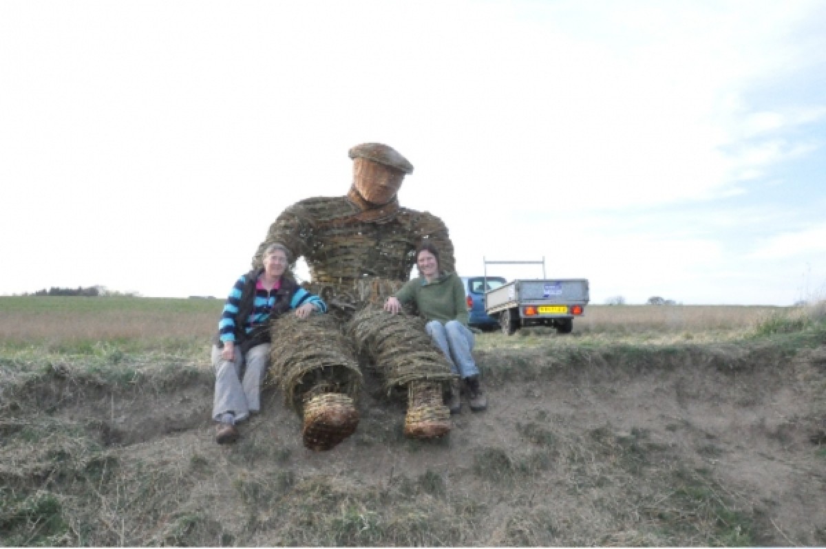 At Burnhall, near the city of Durham, the Woodland Trust has recently planted a new woodland on the banks of the River Wear, where myself and Anna Turnbull recently made a sculpture of a coal miner out of willow. It is twice life size, sitting on the edge of a steep bank, overlooking the river. We enjoyed the challenge and having to come up with solutions on the spot in order to construct him. It took four days on site to make. On the first day we began with a frame of gnarled holly and black thorn boughs attached to two oak posts. To these we fixed hoops of willow to form the initial outline of the legs and arms. Anna had the forethought to pre make a head out of buff willow and a large flat cap out of coloured willow. On the second day we continued attaching the hoops and also made the structure of the bottom half of the jacket. This was done by sticking rods in the ground in two sets, woven through each other diagonally. We also made a scarf by constructing a long, thin, curved woven panel stuck in the ground. This was then removed, and alternate upright rods replaced the other way round in order to weave a border of the same thickness along the two long edges. On day three we clothed the legs and began weaving the jacket. We used thousands of rods of fine willow, including a lot of branched three year old Elegantissima which gave the texture to the legs and arms. On the final day we made the boots and attached them to the legs, installed the hands and finished the outer layer of clothing. The jacket, waistcoat and scarf we contrived to look tweedy with a variety of coloured willow set off with two purple Irrarata buttons and two purple boot laces. Despite it being only March the temperature hovered in the low twenties, so the willow was drying out by the hour and the whole structure shrank and twisted slightly, but this has added to the character of the piece. We had many comments from passers-by. Some people were really drawn to him. I imagine he will become a focal point in the landscape. Quotes: Local man wearing a flat cap.I was sitting on the bank looking at the view, and then walked along here and was shocked to come across him doing exactly the same! Walker.He wont be able to play the piano (Stubby crude hazel fingers). Estonian opera singer.He is very sexy, I will come here and tell him all my troubles. Two ladies with dogs.He looked like a real person from down by the river. We could not believe what we were seeing as we walked up the path! He definitely needs a pipe to smoke, or a bottle of beer.
