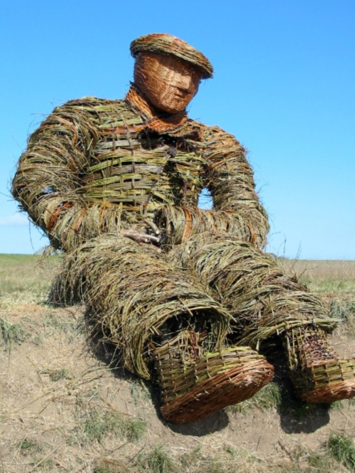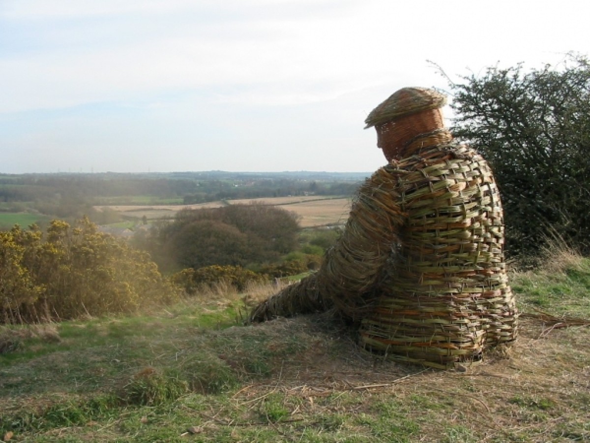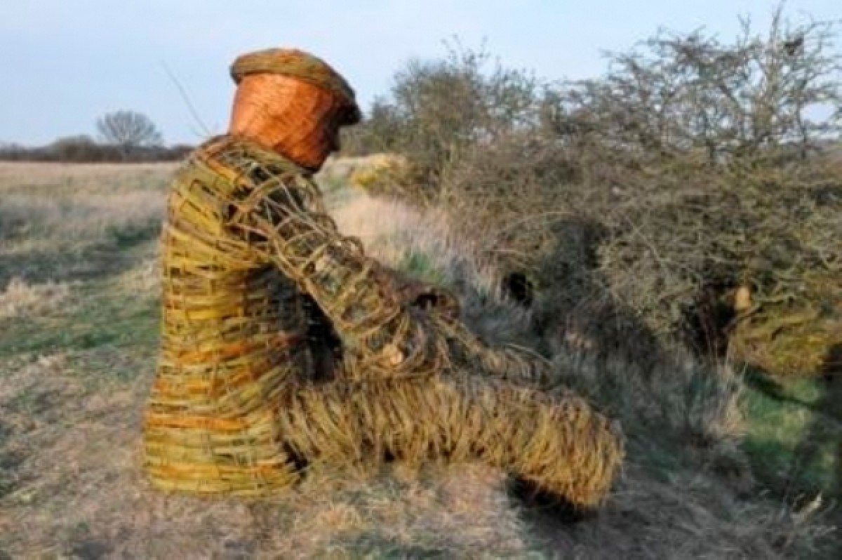 At Burnhall, near the city of Durham, the Woodland Trust has recently planted a new woodland on the banks of the River Wear, where myself and Anna Turnbull recently made a sculpture of a coal miner out of willow. It is twice life size, sitting on the edge of a steep bank, overlooking the river. We enjoyed the challenge and having to come up with solutions on the spot in order to construct him. It took four days on site to make. On the first day we began with a frame of gnarled holly and black thorn boughs attached to two oak posts. To these we fixed hoops of willow to form the initial outline of the legs and arms. Anna had the forethought to pre make a head out of buff willow and a large flat cap out of coloured willow. On the second day we continued attaching the hoops and also made the structure of the bottom half of the jacket. This was done by sticking rods in the ground in two sets, woven through each other diagonally. We also made a scarf by constructing a long, thin, curved woven panel stuck in the ground. This was then removed, and alternate upright rods replaced the other way round in order to weave a border of the same thickness along the two long edges. On day three we clothed the legs and began weaving the jacket. We used thousands of rods of fine willow, including a lot of branched three year old Elegantissima which gave the texture to the legs and arms. On the final day we made the boots and attached them to the legs, installed the hands and finished the outer layer of clothing. The jacket, waistcoat and scarf we contrived to look tweedy with a variety of coloured willow set off with two purple Irrarata buttons and two purple boot laces. Despite it being only March the temperature hovered in the low twenties, so the willow was drying out by the hour and the whole structure shrank and twisted slightly, but this has added to the character of the piece. We had many comments from passers-by. Some people were really drawn to him. I imagine he will become a focal point in the landscape. Quotes: Local man wearing a flat cap.I was sitting on the bank looking at the view, and then walked along here and was shocked to come across him doing exactly the same! Walker.He wont be able to play the piano (Stubby crude hazel fingers). Estonian opera singer.He is very sexy, I will come here and tell him all my troubles. Two ladies with dogs.He looked like a real person from down by the river. We could not believe what we were seeing as we walked up the path! He definitely needs a pipe to smoke, or a bottle of beer.