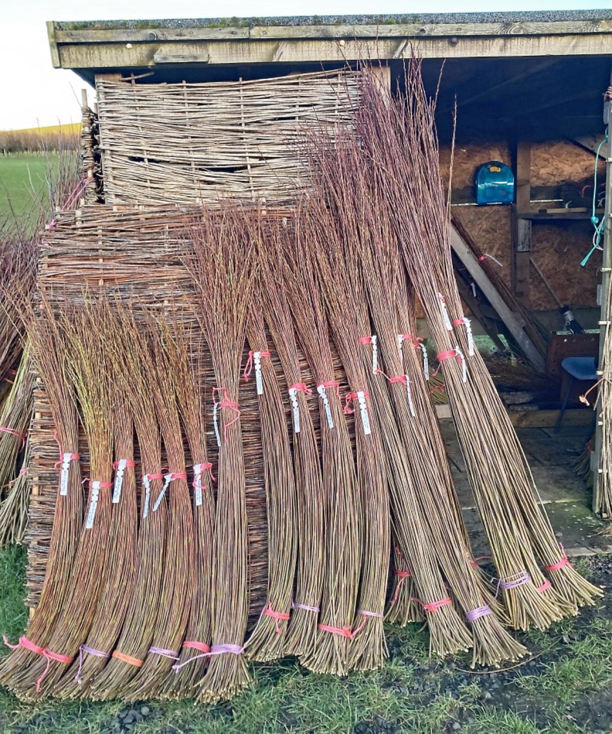 The sorted bundles, labelled and stacked outside the storage shelter, show the rich colours of this beautiful variety. This year, the crop of Brittany Green includes a good range of fine rods, with substantial quantities of three, four, five and six-foot-long rods.