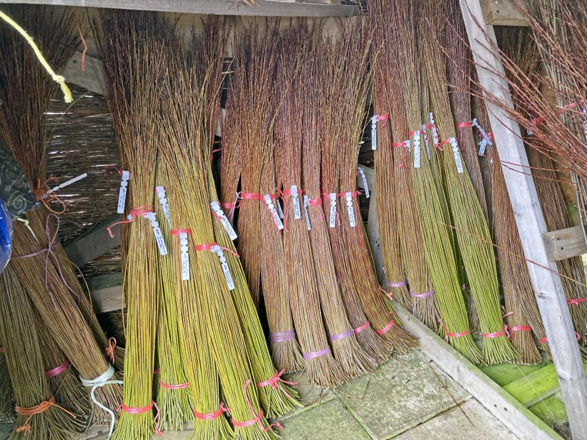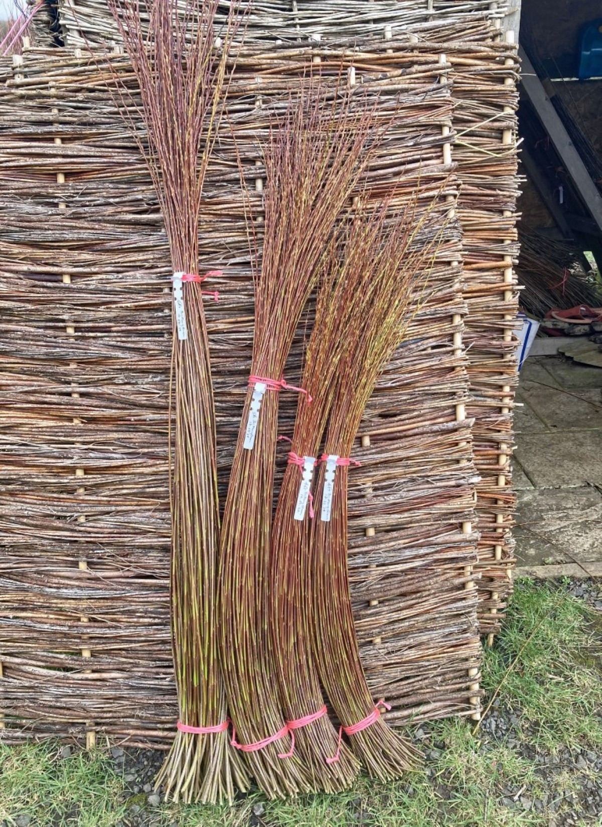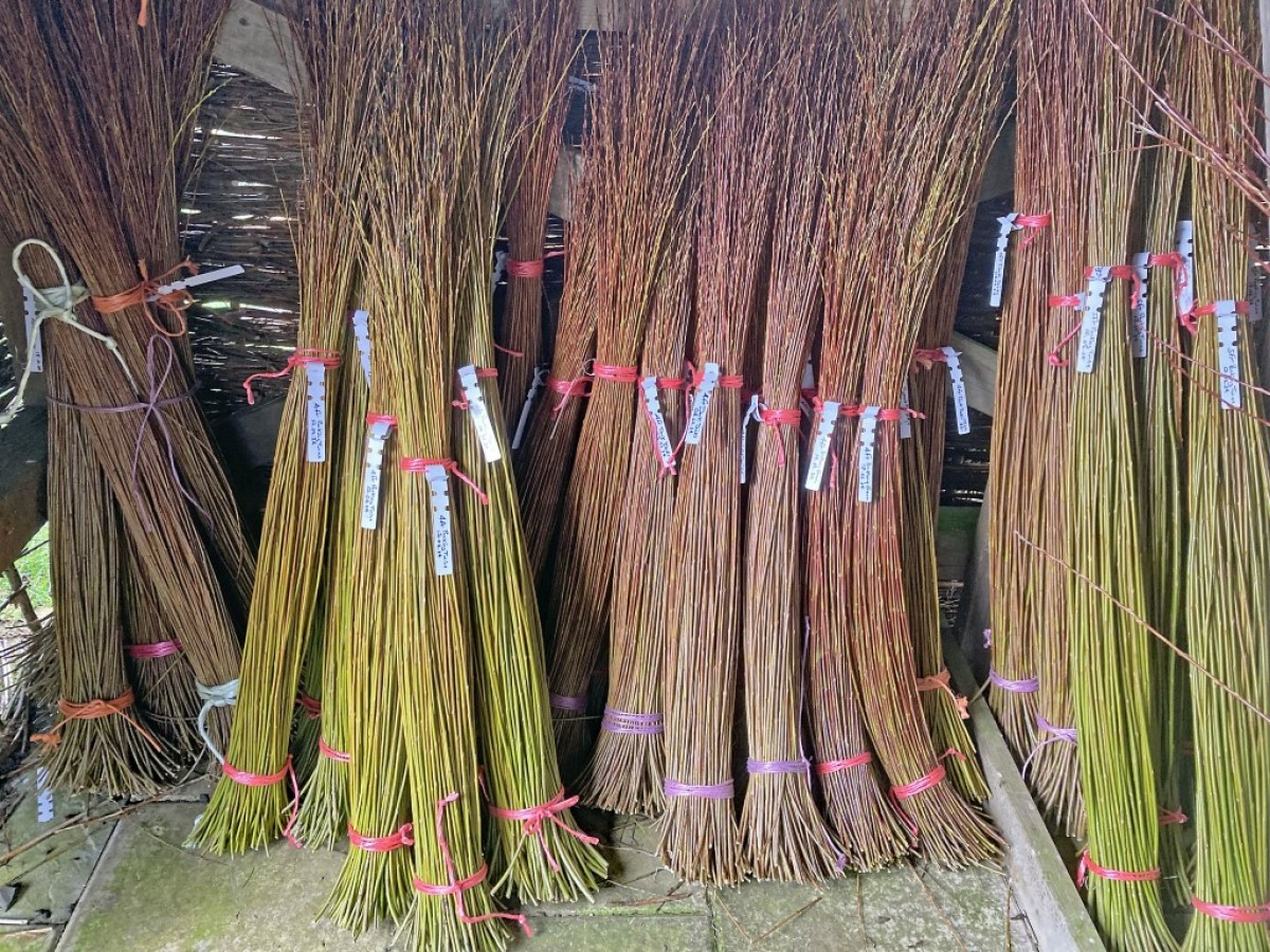 The final two Salix Purpurea varieties to be cut and sorted at Chester Hope this season are Packing Twine and Brittany Green. The rods provide a delightful contrast in colour. The Packing Twine rods are bright green with a lovely sheen when freshly cut; the Brittany Green rods are a vivid dark red. Only sixty-four stools of the latter variety remain to be cut and processed! (There are around five thousand stools at the plot). The images show the bundles of rods following sorting for size, and in the site store.