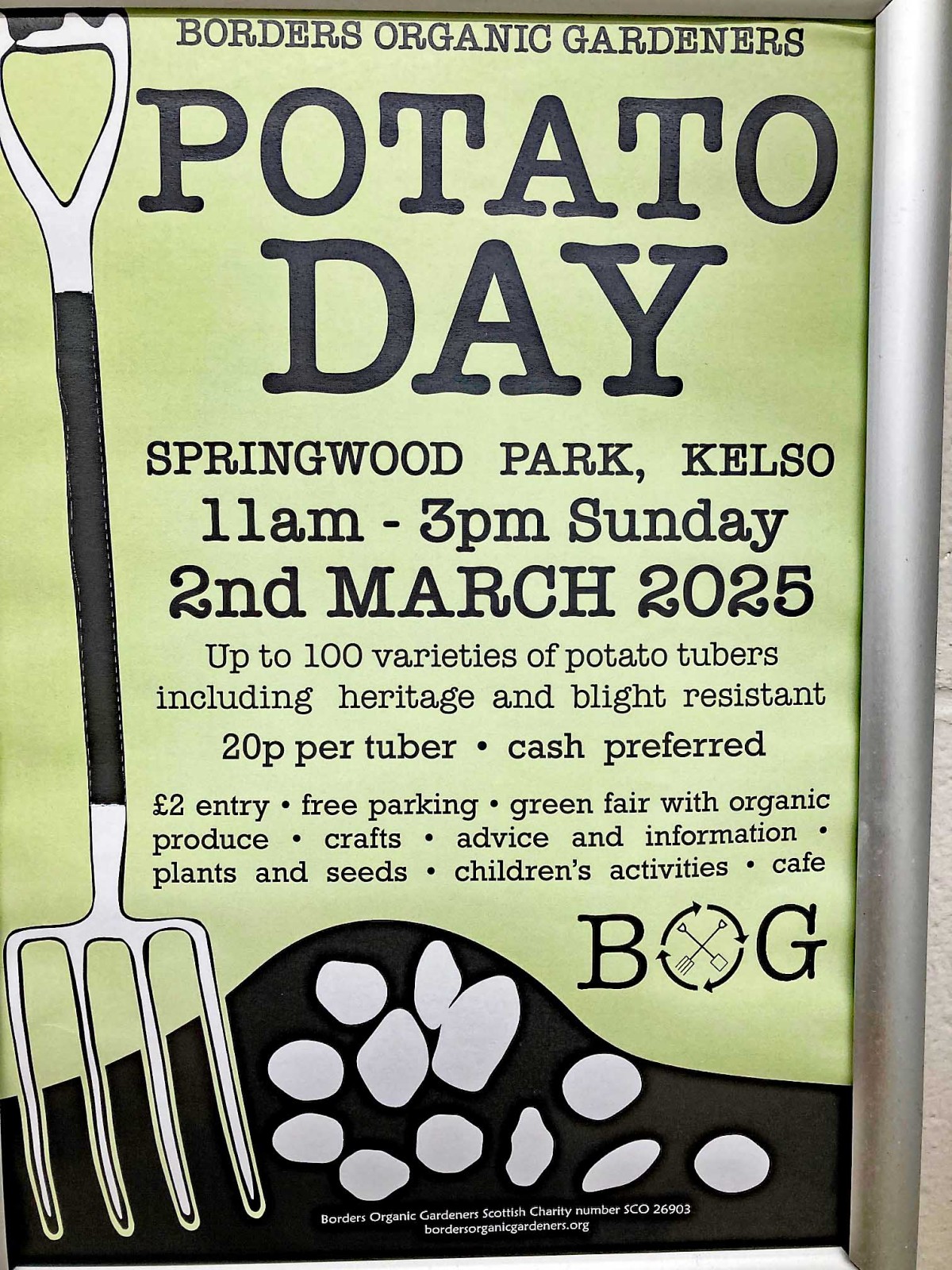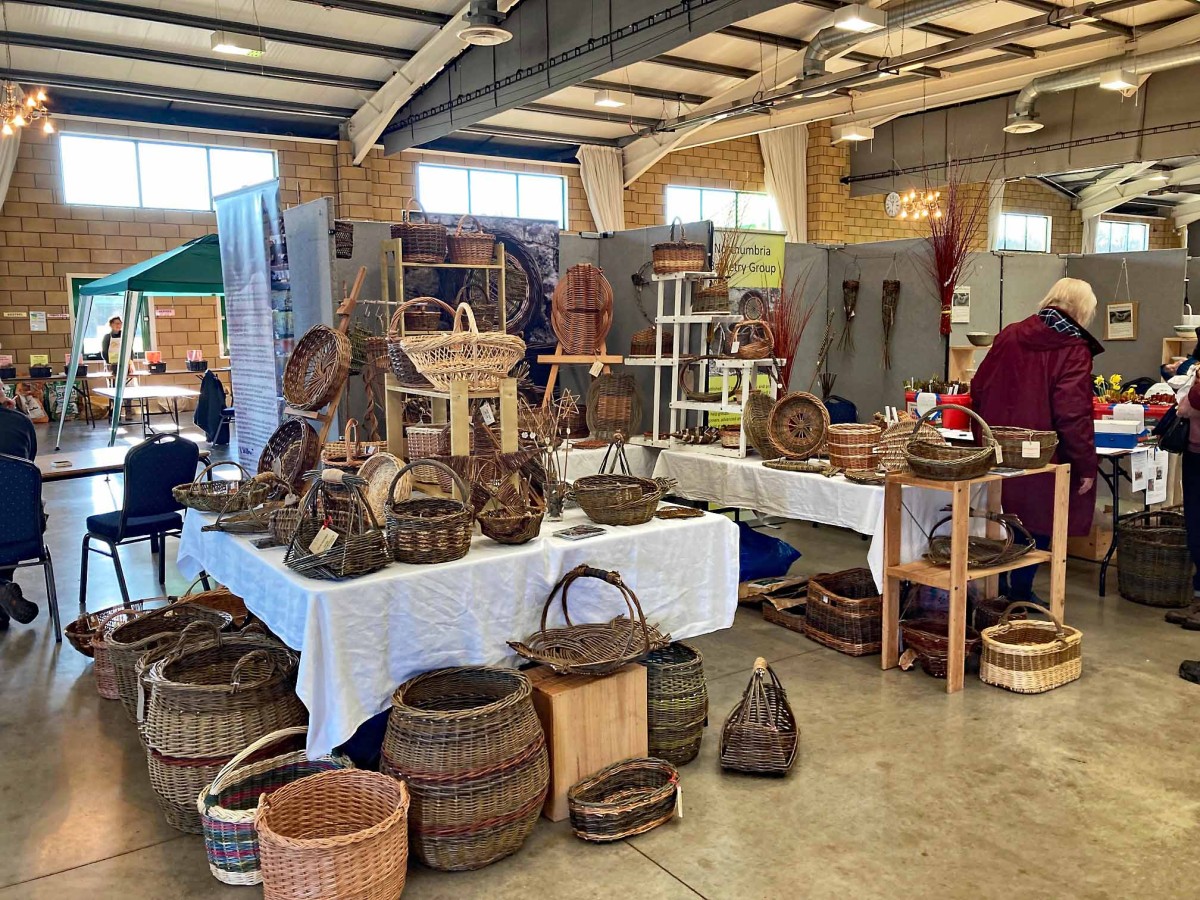 Another local reminder of Spring is the annual Borders Organic Gardeners Potato Day event at Springwood Park, Kelso. This year, the event was held on Sunday, March 2nd. The Northumbria Basketry Group stand had an extensive display of baskets and garden items in willow and a comprehensive range of willow cuttings. With over a thousand members of the public attending the show and lots of interest in baskets, the Basketry Group members had a hectic time serving members of the public. Thank you to everyone who contributed to the success of the event.