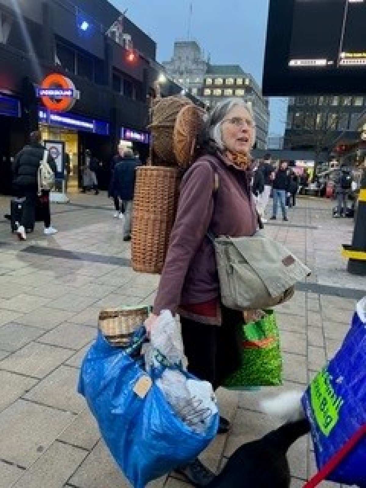Travelling by train down to London laden with work was no mean feat. A photo is attached of Charlotte at King’s Cross Station. Hat’s off to you Charlotte, and somewhere in there is even a bunch of fresh flowers from her garden to adorn the display with colour and charm. Thank you, Lorna Singleton for the photograph, who was very neatly packed with one hand spare and able to use her camera.